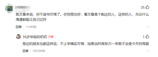 有网友表示“看文章是个豁达的人,这样的人,无论什么境遇都能让自己过好”,对此,当事人回复称“身边的朋友也都这样说,不上学确实可惜,如果当时再努力一年就不会是今天的局面”,并且劝慰网友“不需要羡慕,过好自己的生活比啥都重要”。