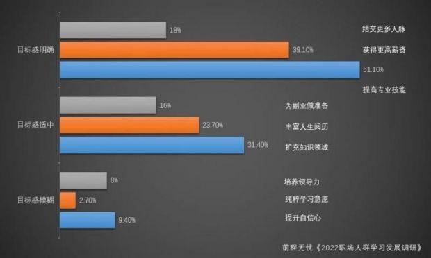 《调研》根据不同驱动因素将职场中接受教育的用户大致分为“目标感明确、适中及模糊”三类。其中,目标感明确的人群中,“提高专业技能”占比高达51.1%,另有39.1%和18%的受访者为获得更高薪资、结交更多人脉。目标感适中的人群中,31.4%以期扩充知识领域,23.7%和16%为丰富人生阅历、为副业做准备。