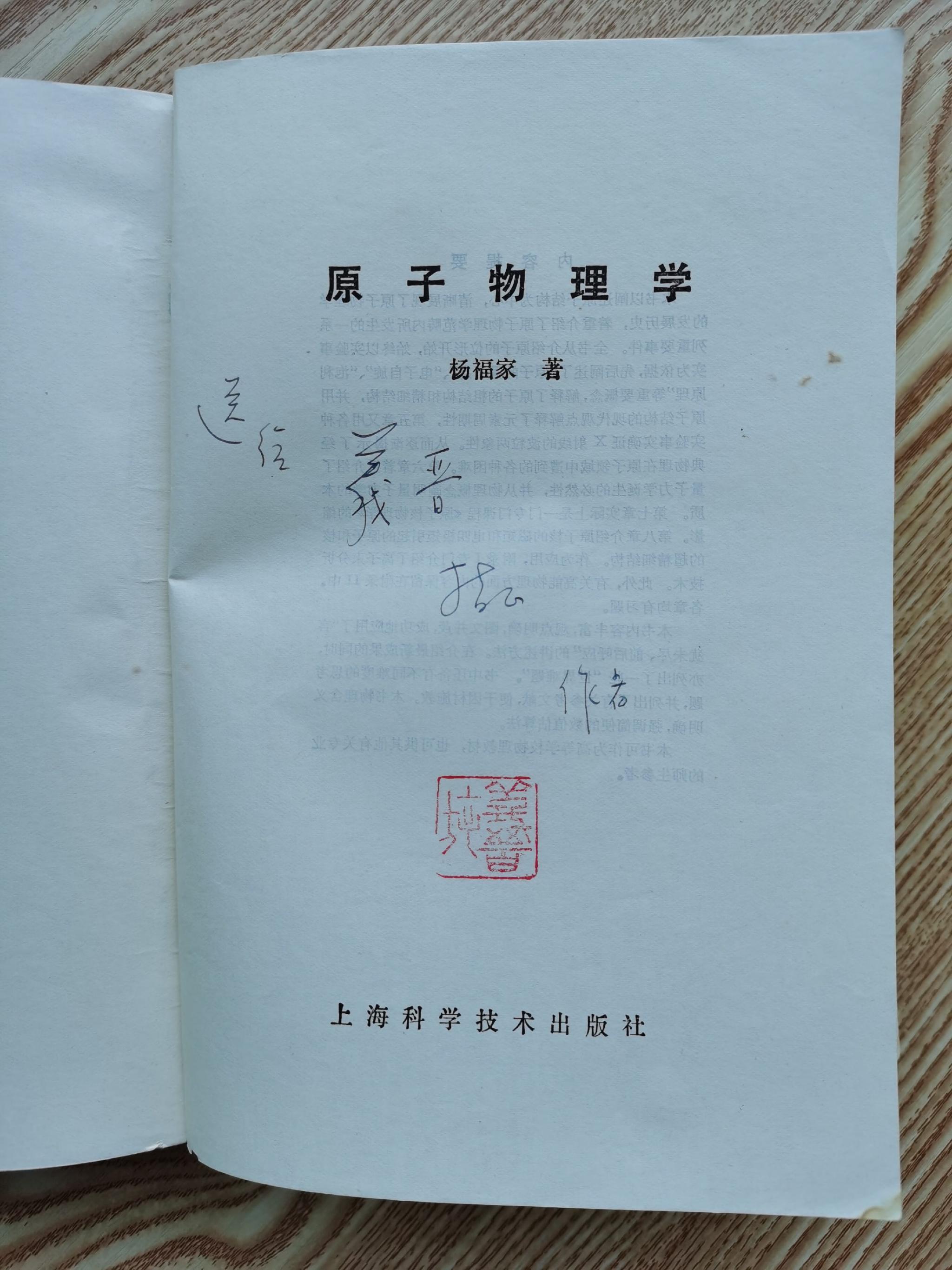 图为杨福家先生著作:《原子物理学》,上海科学技术出版社,1985年第一版。杨福家先生于1986年签名赠送给施义晋。 施义晋供图