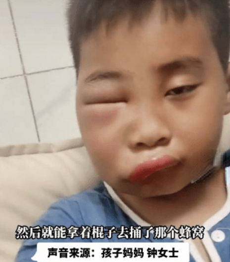 7月22日,据四川广播电视台视频报道,7月19日,在四川自贡,小男孩贪玩和小伙伴一起桶蜂窝,结果被蜜蜂蜇肿半张脸。