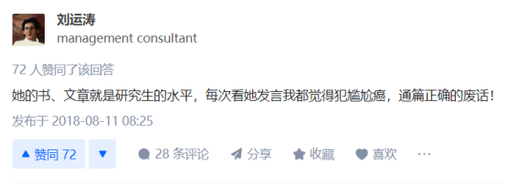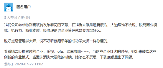 然而,如同所有的流量网红那般,陈春花的管理学的也像是快餐消费型——初看陈春花的文章时,觉得哪哪都对,然而看完也就看完了,仅仅靠几句口号式的结论根本不可能有指导作用,以后该咋样还是咋样。