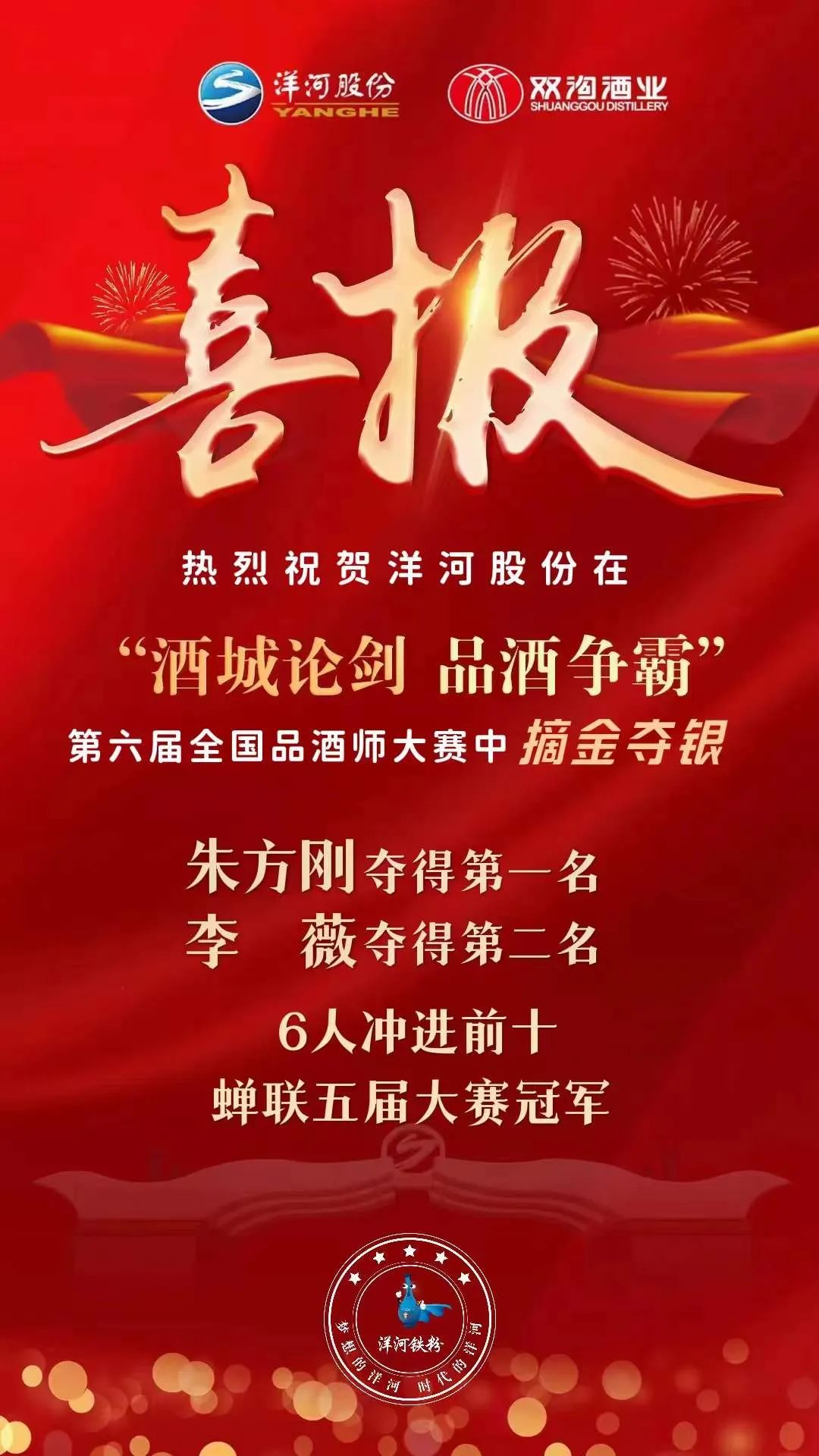 7月13日,“酒城论剑 · 品酒争霸”第六届全国品酒师大赛揭榜:洋河股份朱方刚夺得第一名,李薇夺得第二名。