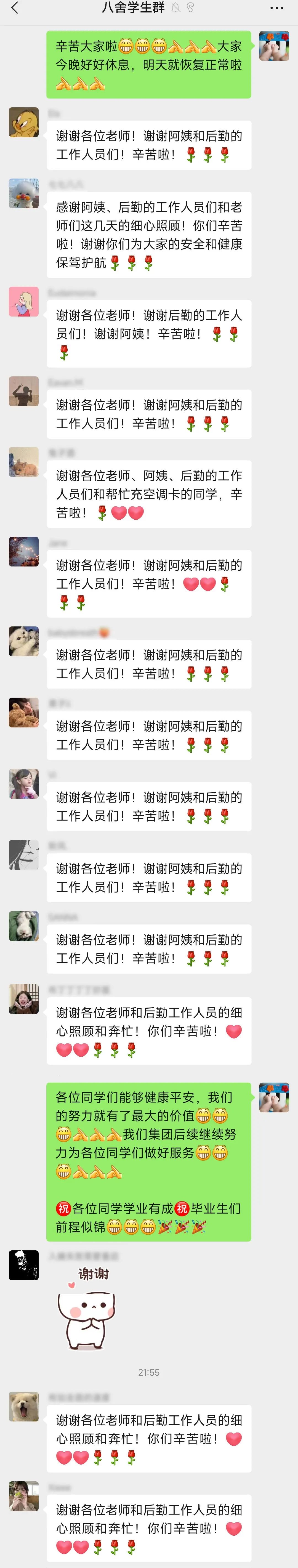 宿管阿姨和保洁人员都很辛苦,后勤人员和老师们为我们免费发放饮用水、精心准备一日三餐(今天晚上的菜特别好吃,香菇滑鸡得到了大家的一致认可哦)、解决生活问题,同学们互相打气,交换正能量,实名表扬我们班坚守岗位的班干部。这就是武大最真实的模样,也是我们爱的模样!