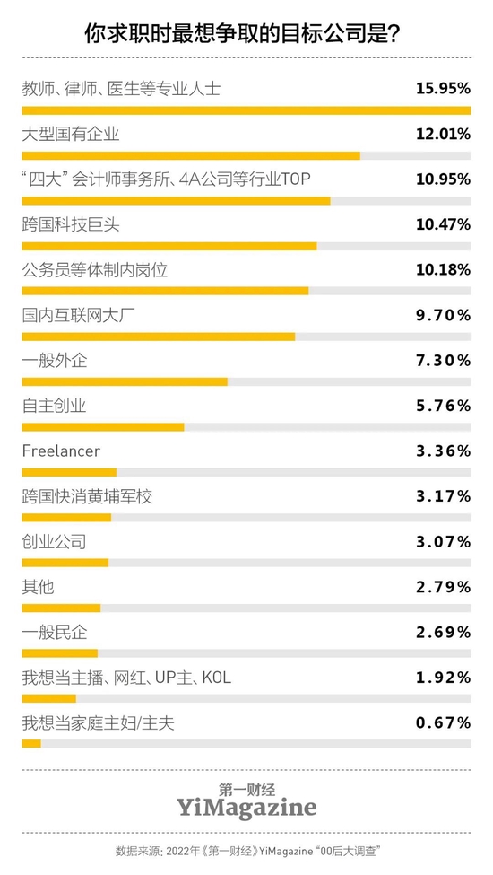 一个比较明显的趋势是,大厂的确正在失去年轻人。和前几年毕业生一窝蜂想挤进大厂的情况不同,今年的毕业生或许受到经济环境以及疫情的影响,在选择工作时对稳定性的渴求更高。根据智联招聘统计的数据,今年毕业生在求职时最看重的因素中,“稳定”取代了“能学到新东西”,上升至第三位。而《第一财经》杂志在此次针对00后的调研中也发现,他们求职时最想争取的目标中,稳定性更高的教师、律师、医生等职业,以及大型国有企业排在前两位。